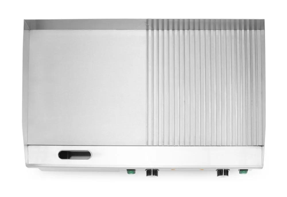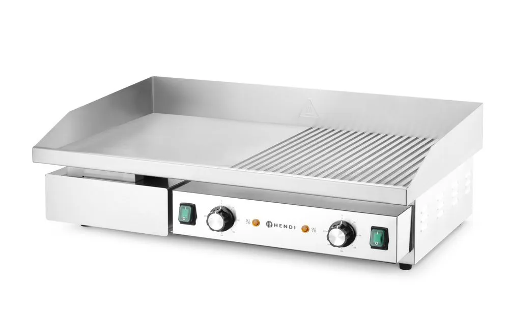 De HENDI bakplaat half vlak, half geribbeld is voorzien van een gehard stalen rooster en 2 afzonderlijke verwarmingszones die temperaturen tot 300°C kunnen bereiken. Het geribbelde gedeelte is perfect voor het bereiden van vet vlees en worstjes, terwijl het platte gedeelte perfect is voor eieren en pannenkoeken. De combinatie van de spatranden en de verwijderbare vetlade zorgt voor eenvoudige reiniging en een hoge hygiëne.