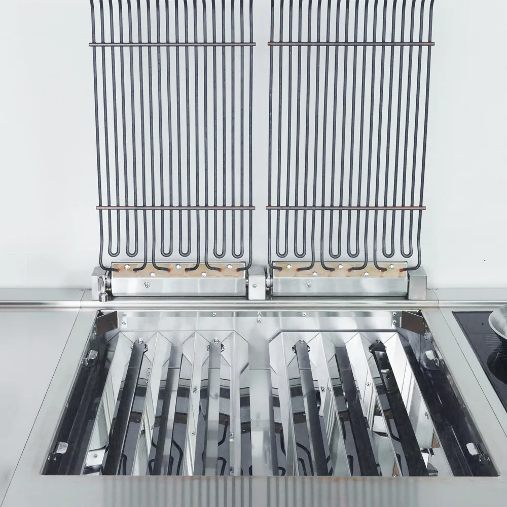 Maximaliseer uw opbrengst met HIGH POWER elektrische roosters. Het unieke ontwerp van de U-vormige grillroosters die de verwarmingselementen omhullen, in combinatie met de deflectoren eronder, zorgt voor een snelle garing over het hele oppervlak en een soepel beheer van productiepieken, waardoor u kostbare tijd bespaart! De beperkte ruimte tussen de verwarmingselementen en de roosters vermindert de energiebehoefte, wat leidt tot aanzienlijke kostenbesparingen! Het geïntegreerde waterreservoir garandeert een uitzonderlijke bereiding door stoom te genereren en de sappen te recupereren, waardoor de rookontwikkeling wordt beperkt.