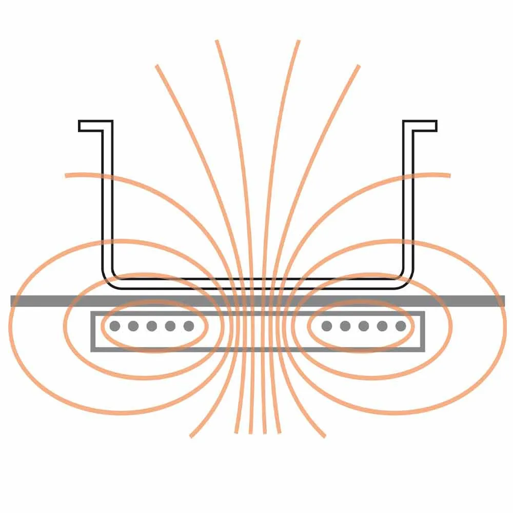 De warmte wordt geproduceerd door een magnetisch veld rechtstreeks in de container. Dit veld wordt elektronisch gecreëerd en er is geen verwarmingselement, waardoor het extreem veilig is. Koken gebeurt vrijwel zonder warmteverlies; dit is de meest economische technologie, omdat het verwijderen van de recipiënt voldoende is om het koken te stoppen. Er worden achtereenvolgens drie natuurkundige fenomenen in werking gesteld: