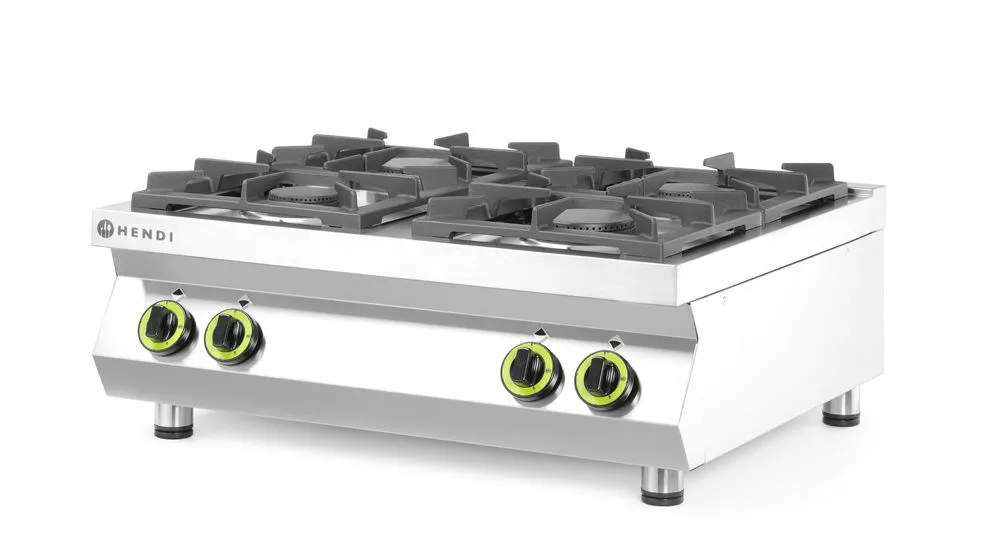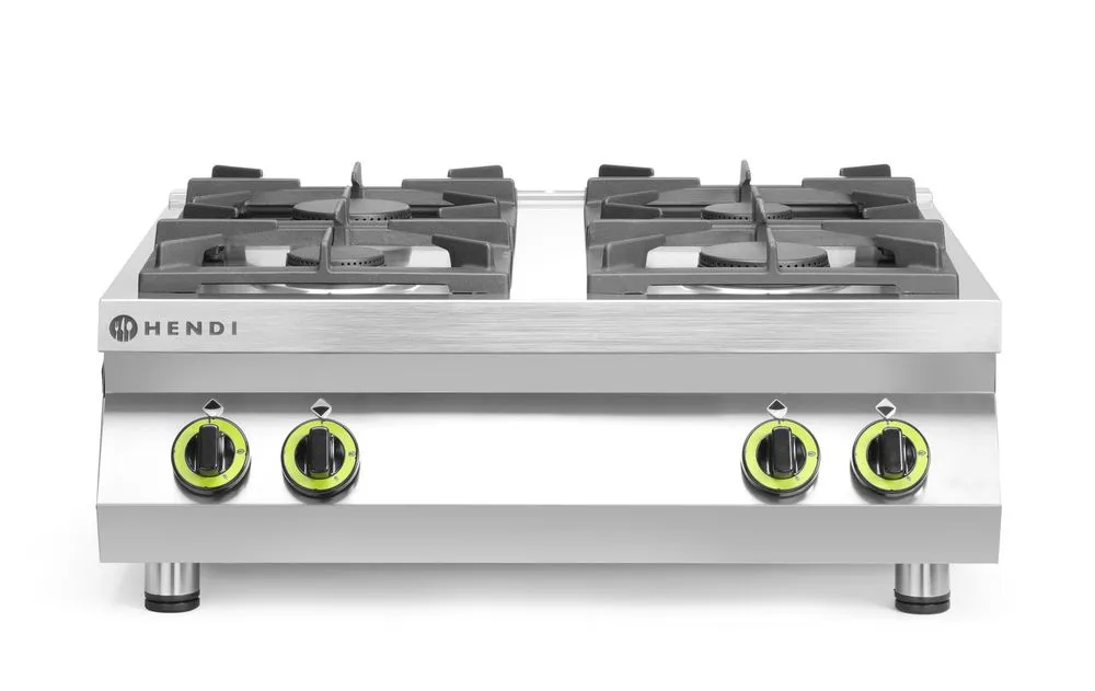 De HENDI Gasfornuis 4-pits Kitchen Line – tafel model is een zware uitvoering gaskookplaat geschikt voor pannen tot ø 300 mm. Deze beschikt over twee branders van 3,5 kW en twee krachtige branders van 6,5 kW. De 4 verwijderbare pannendragers zijn gemaakt van gietijzer.
