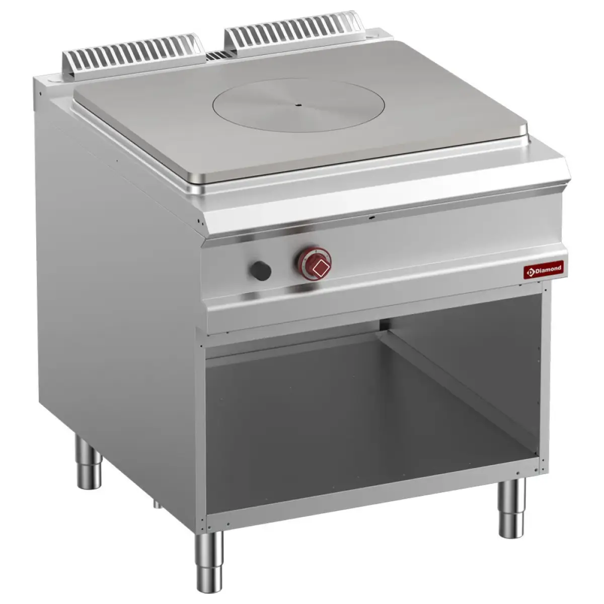 - Doorkookplaat in gietijzer (10mm) met hoog warmtegeleidingsvermogen, centrale verwijderbare brander, gasverwarming door een brander die zich in het midden van de verbrandingskamer bevindt, keramische isolatie. Regeling d.m.v. gaskraan (+/- 500°C), piëzo-elektrische ontsteking en thermokoppelveiligheid, toegankelijkheid aan de voorzijde voor een zeer eenvoudig onderhoud.