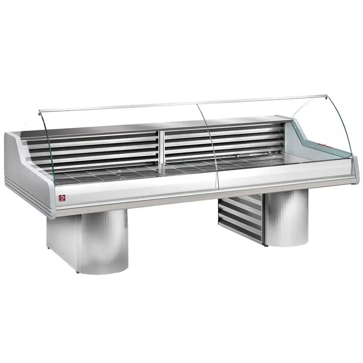 Gekoelde vitrine toonbank met gebogen ruit, op sokkels
