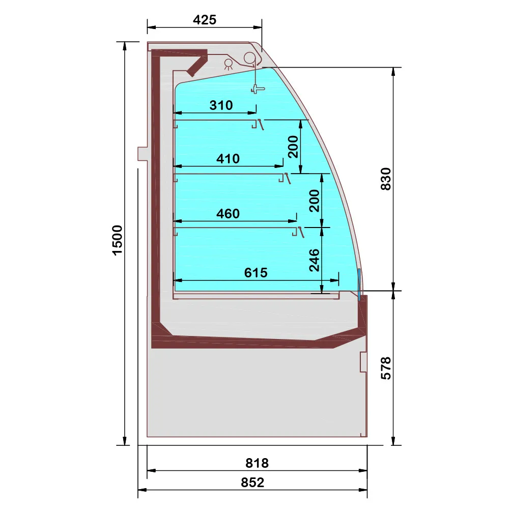 - Displaydiepte 615 mm, hoogte 830 mm.