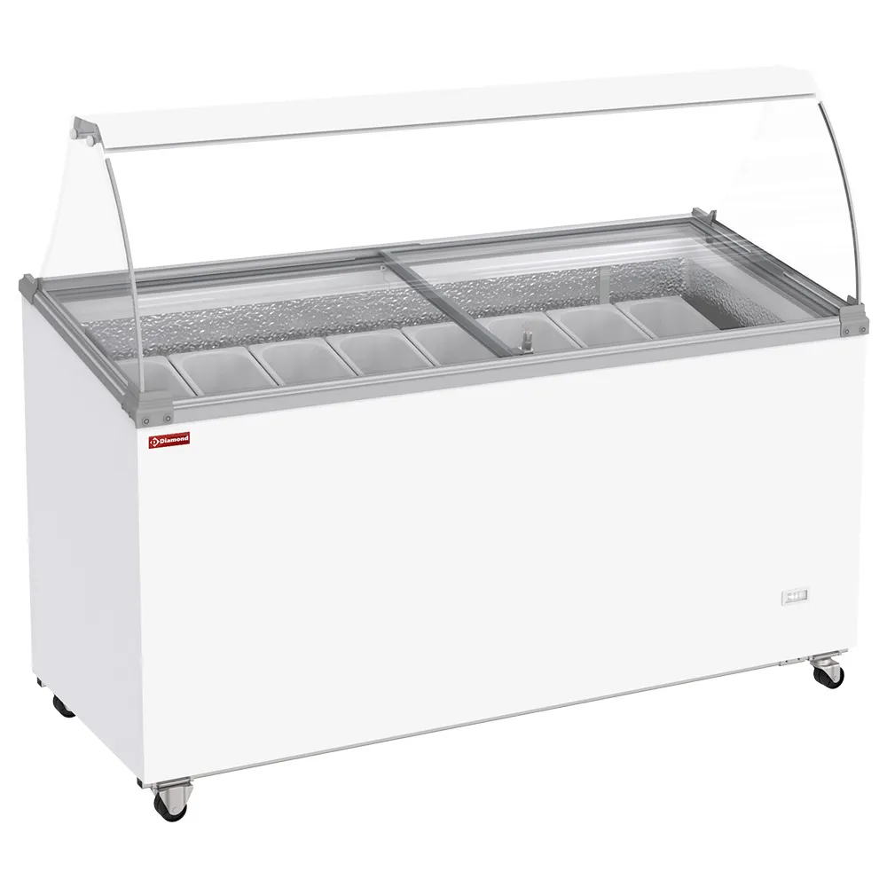 IJsconservator met toonbank, 467 liter, schuifdeksels op wieltjes met gebogen glas, capaciteit voor 8 bakken