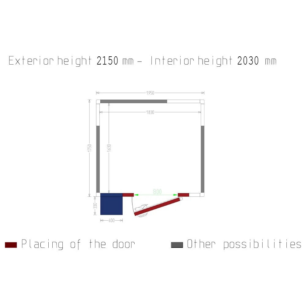 - Interne afmetingen 1830 x 1630 x h 2030 mm.