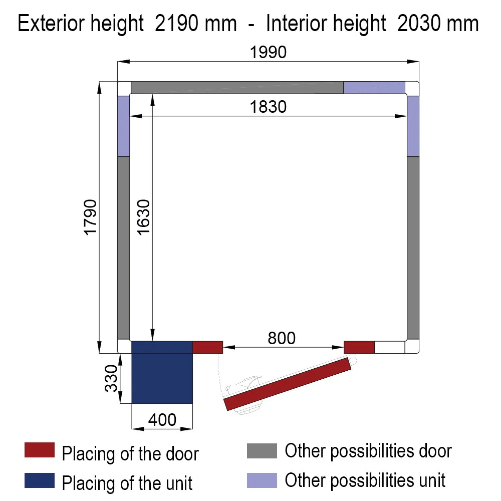 - Vrije deuropening 800 xh 1900 mm (plaatsing van de deur naar keuze, op alle 4 zijden).