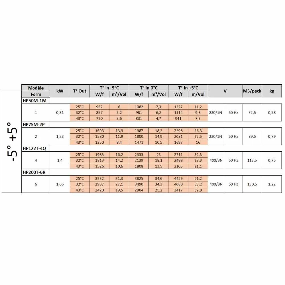 - Koelvermogen 3490 (W/f) voor een kamerinhoud van 34,3 m³ / 34300 liter (Interne T° 0°C & Externe T° +32°C).