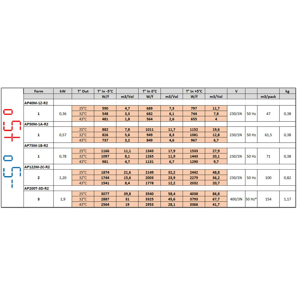 - Koelvermogen 949 (W/f) voor kamerinhoud 8 m³ / 8000 L (interne T° 0°C & externe T°+32°C).