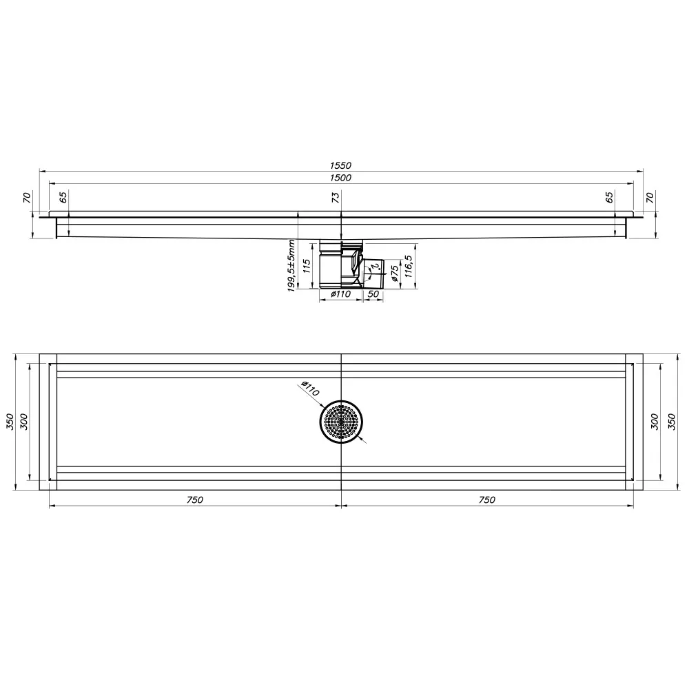 Roestvrij stalen vloerafvoergoot 1500×300, zijdelingse uitgang