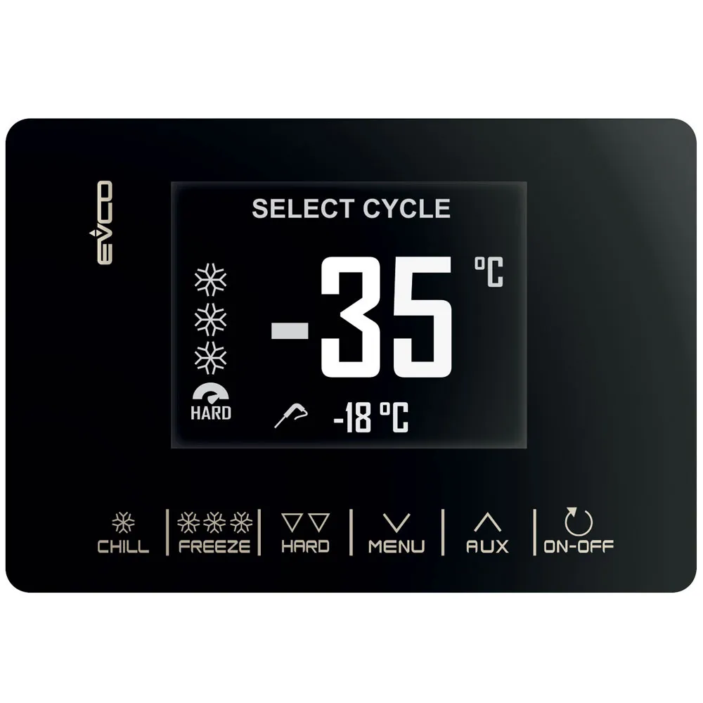 ADVANTAGE: Controller met groot, verlicht display en aanraakgevoelige toetsen (IP65). Regeling van koel- of vriescycli (met “Hard/Soft”-functie), op tijd of op temperatuur (kernsonde). Geheugen voor HACCP-alarmen en diverse programma’s…… Voedselveiligheid in de koudeketen is gebaseerd op een basisprincipe: d.w.z. de kerntemperatuur gaat van +70°C naar +3°C in 90 minuten (UK-normen) of +65°C naar +10°C in 110 minuten (NF-normen) en van +70°C naar -18°C in 240 minuten (UK-normen) of van +65°C naar -18°C in 270 minuten (NF-normen), de Diamond cellen garanderen naleving van al deze verplichtingen.