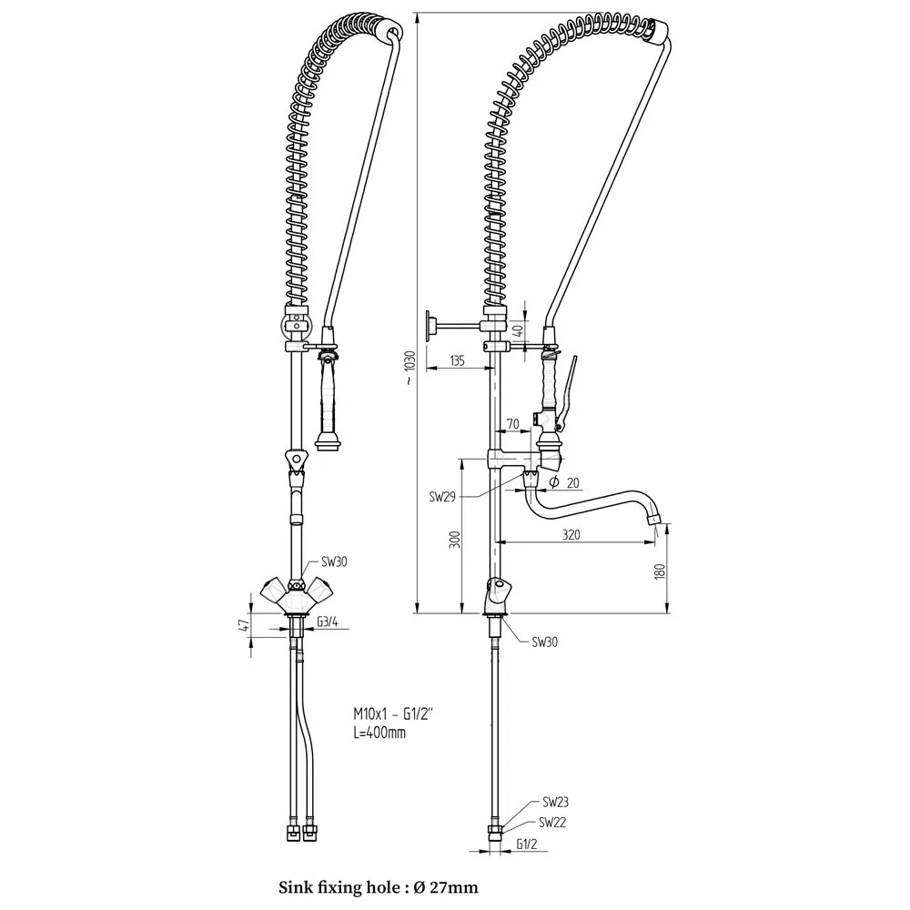 - Eengatsaansluiting op toestel 3/4″ (Ø 29mm).