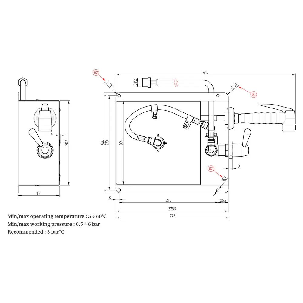 - Maximale werkdruk 6 bar en maximum watertemperatuur van 60°C.