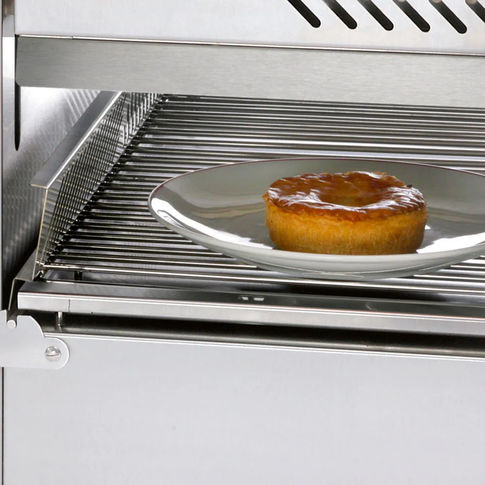 - Verwijderbare schotel, met rooster, afm. 533×370 mm, mogelijk om GN platen te gebruiken, het geheel is verschuifbaar aan de voorzijde.