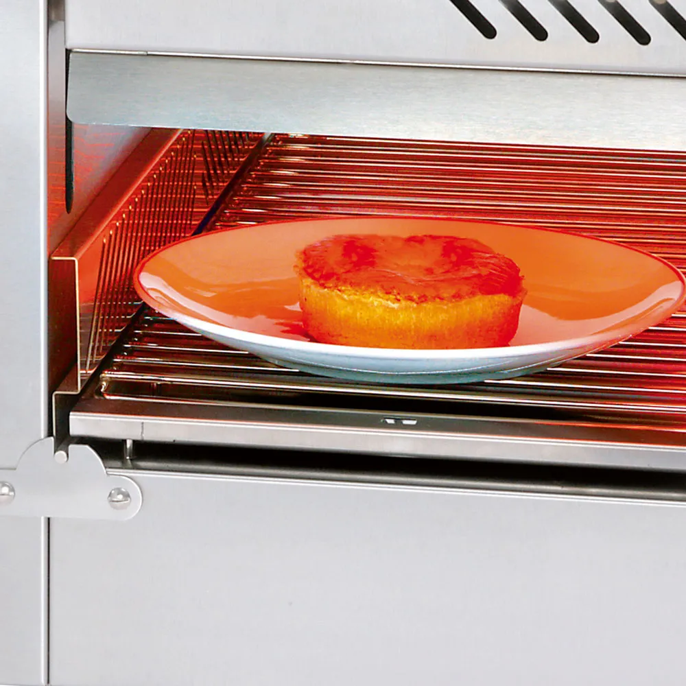 - Verwijderbare schotel, met rooster, afm. 735×370 mm, mogelijk om GN platen te gebruiken, het geheel is verschuifbaar aan de voorzijde.